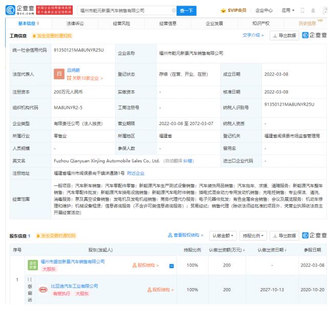 企查查APP显示,3月8日,福州市乾元新景汽车销售有限公司成立,法定代表人为吕炳蔚,注册资本200万元人民币,经营范围包含:汽车新车销售;汽车零配件零售;新能源汽车生产测试设备销售;新能源汽车换电设施销售;新能源汽车电附件销售等。企查查股权穿透显示,该公司由比亚迪汽车工业有限公司间接全资控股。